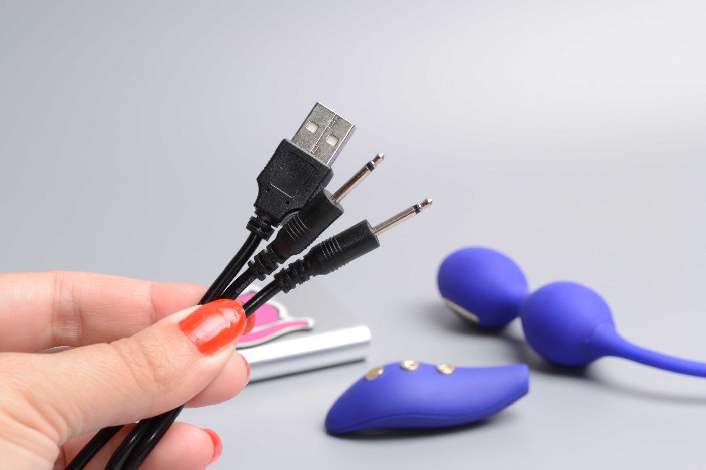 Napravo in krmilnik lahko napolnite s kablom USB. Tanko konico priključka potisnite v zaslonsko vtičnico, ki jo najdete na koncu stebla pod oznako DC v kroglicah in na ožji strani gonilnika. Nasprotni konec kabla s ploščatim priključkom vtaknite v adapter za mobilni telefon. Žogice so od proizvajalca prišle napolnjene do približno 75 % in so v uporabi zdržale približno eno uro, vendar priporočamo, da pred uporabo igračo napolnite do konca. S tem boste prihranili baterijo pripomočka. Pri najmočnejši stopnji vibriranja nam je pripomoček vibriral 1 uro in pol, nadaljnje polnjenje pa je trajalo 70 minut. Da se kroglice polnijo, lahko ugotovite po modro utripajoči diodi, ki se prižge, ko je pripomoček napolnjen.