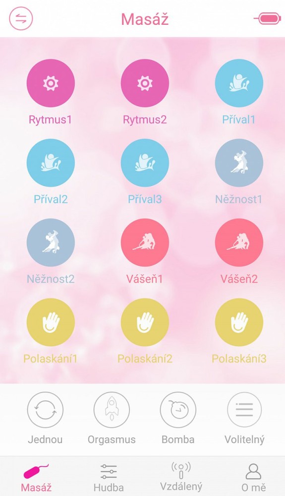 Odprla se bo glavna plošča pod razdelkom za masažo z 12 vrstami vibracij. Pod menijem z vibracijami boste našli meni s 4 programi (ponavljanje, orgazem, bomba in izbirno).
